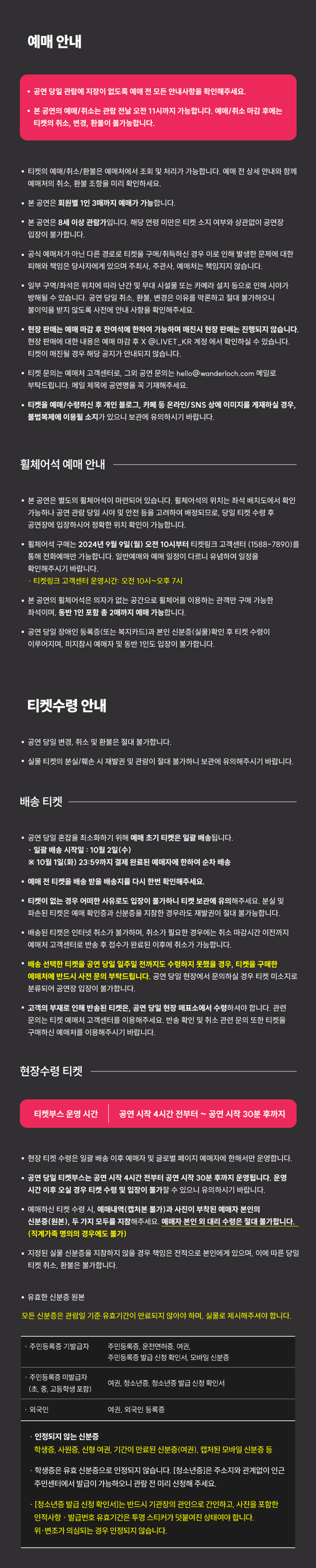※ For overseas residents must purchase tickets through the GLOBAL WEBSITE. Tickets booked via the global pages on either website can be collected on-site only. On the day of the concert, please visit the ticket booth at the concert venue and present your (the person who booked the ticket) ID and booking statement/confirmation to receive your ticket.
