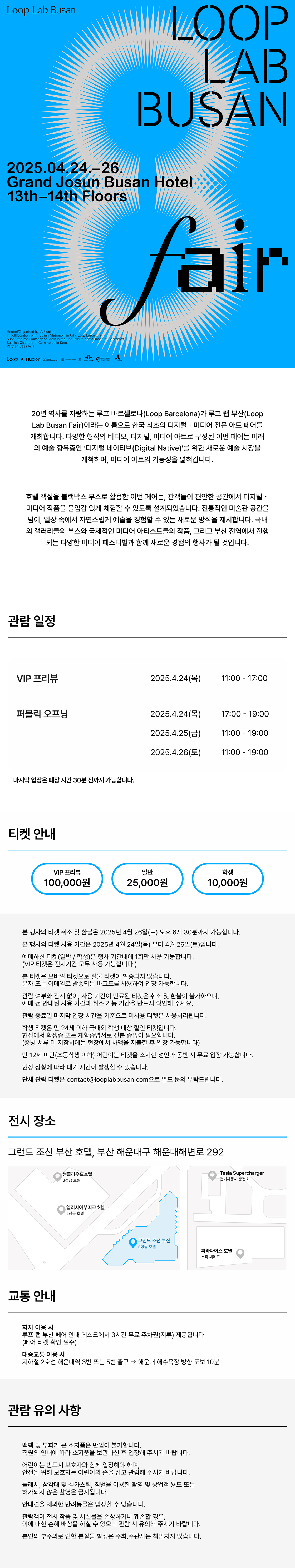 | Operator | 아티비스트 | Customer service | 전시티켓 : 1588-7890 / 전시운영: contact@looplabbusan.com |